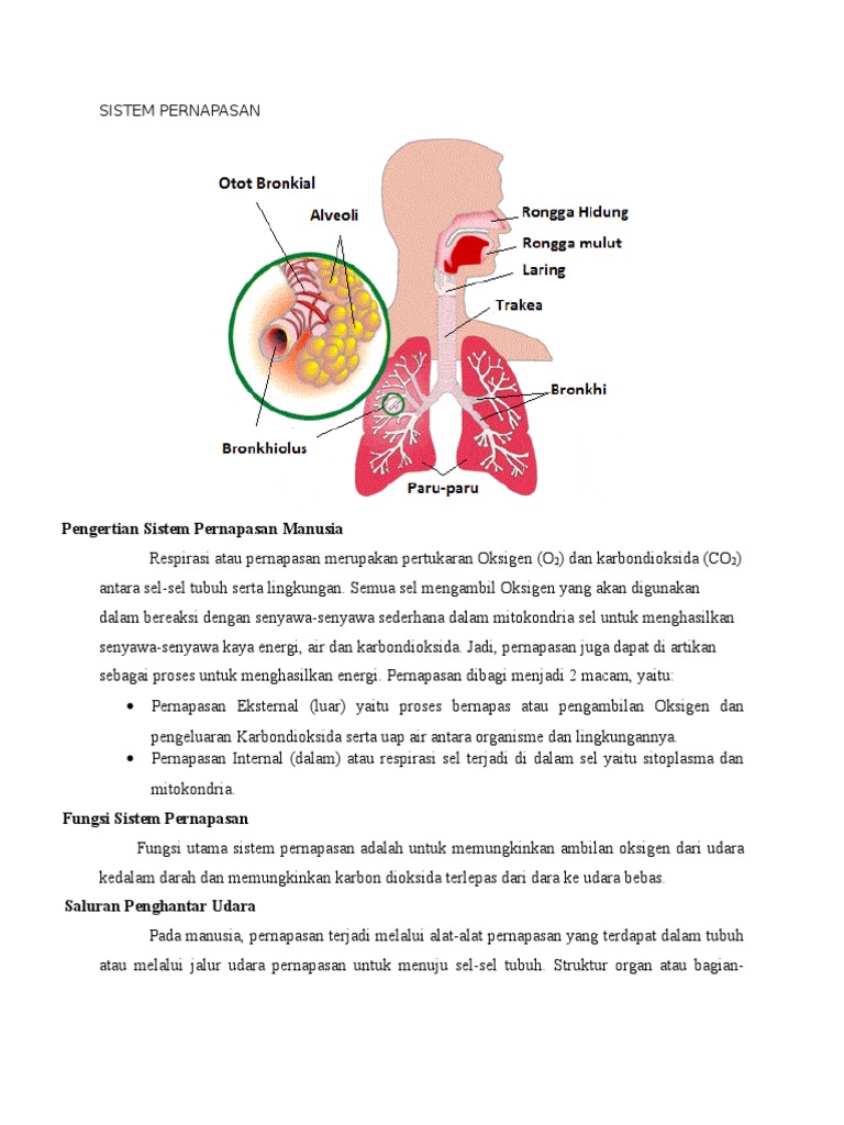 Proses pernapasan dibedakan menjadi pernapasan dada dan pernapasan perut. Proses pertukaran oksigen dan karbondioksida proses pertukaran oksigen (o2) dan karbondioksida (co2) terjadi dalam alveolus dan jaringan secara difusi. Pertukaran oksigen dan karbondioksida dalam kapiler terjadi secara osmosis di alveolus dan sel jaringan tubuh pada alveolus, molekul gas akan bergerak melalui membran respirasi dari tekanan tinggi ke rendah Yang paling bagian oksigen (sekitar 97%) kini dilakukan oleh eritrosit atau bpr cs. Pertukaran gas antara oksigen dan karbon dioksida terjadi pada alveolus dan jaringan tubuh sel lewat proses difusi. Mekanisme difusi udara pada paru terjadi karena perbedaan tekanan oksigen dan karbondioksida pada alveolus dan pembuluh darah kapiler paru.12. Proses pertukaran oksigen ( o2) dan karbondioksida. Percampuran antara gas yang baru saja masuk ke dalam paru dengan yang lebih dahulu masuk akan komplit dalam hitungan perpuluhan detik. Difusi berlangsung menurut konsentrasi dari suatu gradient atau suatu kemiringan. Pada saat yang sama, darah yang mengandung karbondioksida akan dilepaskan. Berikut pertanyaannya adalah di mana oksigen akan pergi. 12 2.2.4 mekanisme sirkulasi sistem sirkulasi sacara garis besar dibagi menjadi dua yaitu sistem sirkulasi sistemik dan sistem sirkulasi pulmonal. Proses difusi terjadi secara bebas.